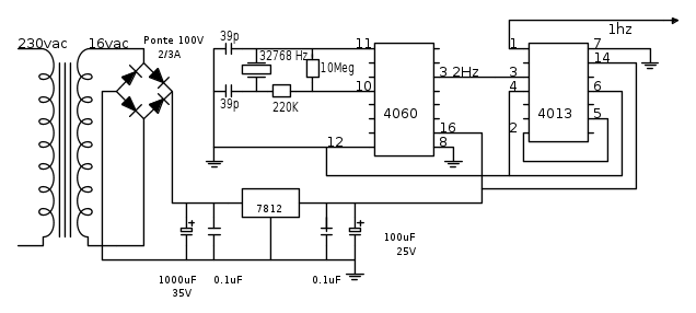 Per ora stai facendo un generatore di "clock", vediamo se funziona, se questo primo blocco non ha problemi potremo continuare. Per verificare al volo se funziona potrai mettere sull'uscita "1 Hz" una resistenza ed un led in serie, e vedere se lampeggia (1 volta al secondo), diciamo che un resistore da 330