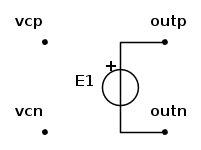 Hai attaccato un generatore di tensione tra i nodi vcp e vcn, ma tra quei due nodi nel sottocircuito non devi attaccare nulla, la tensione di controllo è vcp-vcn (guarda sul manuale come trovare la differenza tra due tensioni