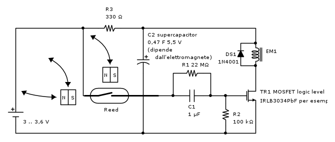 Il MOSFET, il reed, il supercondensatore, la pila al litio-cloruro di tionile (occhio al formato per trovare un portapila adatto, la 14500 corrisponde al formato AA, la 17500 è più panciuta, oppure prendila con terminali; è inquinante, bisogna disfarsene correttamente a fine vita), il diodo, il magnete e l'elettromagnete si trovano facilmente su Aliexpress anche con invio gratuito.