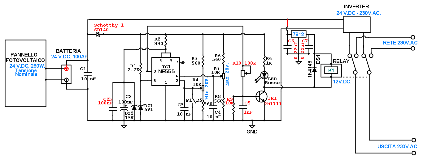 Forse potrei rivedere la combinazione tecnica dell’impianto dato che possiedo altri inverter a 12, 36 e 48V. Quello a 48V è addirittura un sinusoidale da 10.000W mentre il 36V è 2.000W. Il 12V è piccolino: 350W. Potrei forse utilizzare il 36V magari aggiungendo in serie alla batteria da 24 V una batteria da 12V 100 Ampere, ammesso che si possa fare, ma così facendo temo che potrei perdere l’unico schema di controllo soglie che è stato pubblicato, bisognerebbe sentire cosa ne pensa