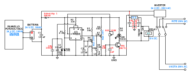 Aggiungo solo una cosa a quanto riportato da Elfo sul collegamento di quel led ... ho guardato meglio lo schema ed ho notato che alimenti il 555 con 15V (ottenuti con la R da 330 e lo zener), pero' leggi la tensione per il comparatore interno direttamente dopo lo schottky (circa 24 V) , ora, dare ad un'ingresso di un chip una tensione superiore a quella di alimentazione dello stesso chip, non e' mai una cosa da fare (salvo alcuni specifici componenti, piu che altro moderni, in cui questo e' previsto espressamente dal costruttore, ma non e' il caso del 555, su molti datasheet non e' neppure indicato ma dove c'e' si specifica input voltage control trigger threshold reset = VCC), sarebbe meglio che tu usassi dei partitori resistivi (anche solo aumentando le due R da 560 che vanno dal positivo ai trimmer, mettile da 10K o 12K se i trimmer sono da 10K e dovresti evitare il problema