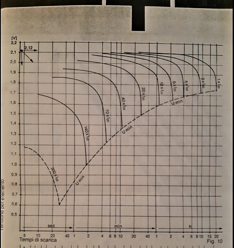 La tensione di fine scarica in funzione della corrente di scarica per un accumulatore a cicli dal catalogo sonnenschein degli anni '80.