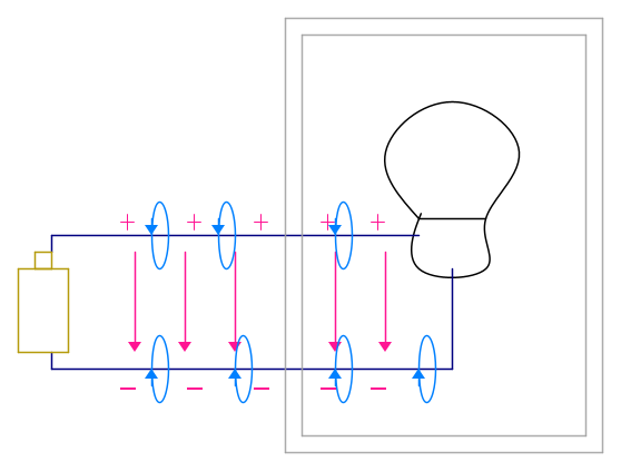 Quei due fili che partono dalla batteria sono una linea di trasmissione realizzata da due conduttori separati. Siccome la linea è realizzata così, ovviamente l’energia viene trasportata in aria, ove sono presenti i campi. Tale linea avrà la sua impedenza caratteristica (dipendente da varie cose come la distanza tra i due conduttori, ecc…). La lampadina é il carico a fine linea: se si modifica il carico, e cioè se si cambia la sua impedenza, (es: si condizionano le linee di campo con un po’ stagnola sul vetro, senza cortocircuitare), si modificano le riflessioni in gioco nella linea e quindi il trasferimento di potenza al carico stesso.