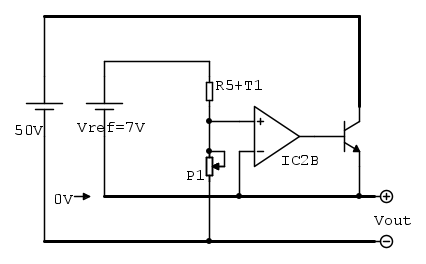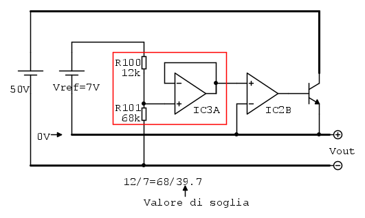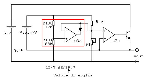 Se il negativo di uscita si allontana oltre -40V dal comune vuol dire che il rapporto P1/(R5+T1) è maggiore del rapporto R101/R100, di conseguenza l'ingresso invertente di IC3A si porta a tensione maggiore di quello non invertente di IC3A, quindi l'uscita di IC3A scende e porta il diodo in conduzione obbligando l'ingresso non invertente di IC2B ad assumere la stessa tensione dell'ingresso non invertente di IC3A e perciò le cose vanno come se all'ingresso non invertente di IC2B, al posto del partitore originale, fosse collegato il nuovo partitore R100-R101 che impone all'alimentatore una tensione fissa pari a circa 40V (39.7V).