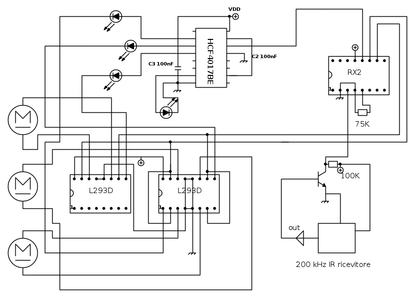 partiamo dall'integrato RX2 questo integrato useremo solo 3 uscite perché: 2 servono per il contorllo del motore cioè di farlo girare o verso destra o verso sinistra, l'altra uscita invece serve per selezionare il motore da azionare cioè: nell'integrato L293D c'è il pin INHIBIT che serve per attivare il motore, ora con il motore che selezionamo dall' HCF4017BE che è un contatore, quindi da così selezionare il motore che serve, poi ho messo dei led perché coì puoi accorgerti di quale motore stai azionando. dove ho scritto ir ricevitore a 200 kHz è il inteso per l'integrato ricevitore che ti ha descritto
