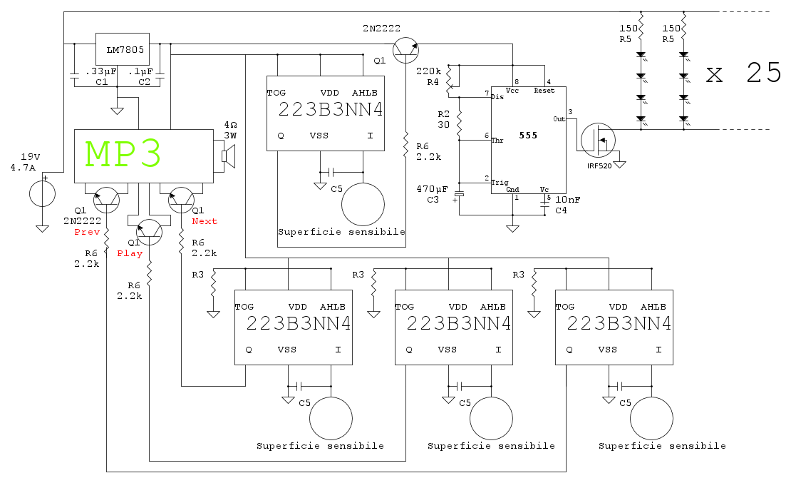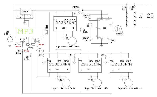 :arrow: La scheda MP3 è stata modificata sotto la guida di un altro simpatico Marco (Foto UtenteMarcoD), i pulsanti sono stati sostituiti da transistor 2n2222 pilotati da pulsanti touch. (Quanto so belli!!!)