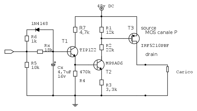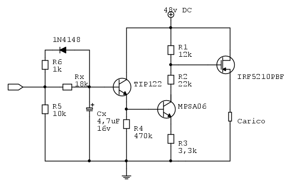 djnz ha scritto:O forse ancora meglio collegarlo in darlington, a regime la tensione collettore-emettitore del transistor di destra dovrebbe aggirarsi su 5V. A questo punto si può anche pensare di sostituire i due transistor con un solo darlington (che ovviamente regga più di 48V).