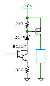 O forse ancora meglio collegarlo in darlington, a regime la tensione collettore-emettitore del transistor di destra dovrebbe aggirarsi su 5V. A questo punto si può anche pensare di sostituire i due transistor con un solo darlington (che ovviamente regga più di 48V).