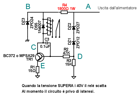 Metti l'uscita dell'alimentatore a 30V circa, alto, ma prima che scatti il rele`. Misura le 5 tensioni che ho segnato. Mi aspetto A=30V, B=24 V, C=24 V, D=0V, E=0V. Il riferimento, puntale nero, e` sul negativo dell'alimentatore.