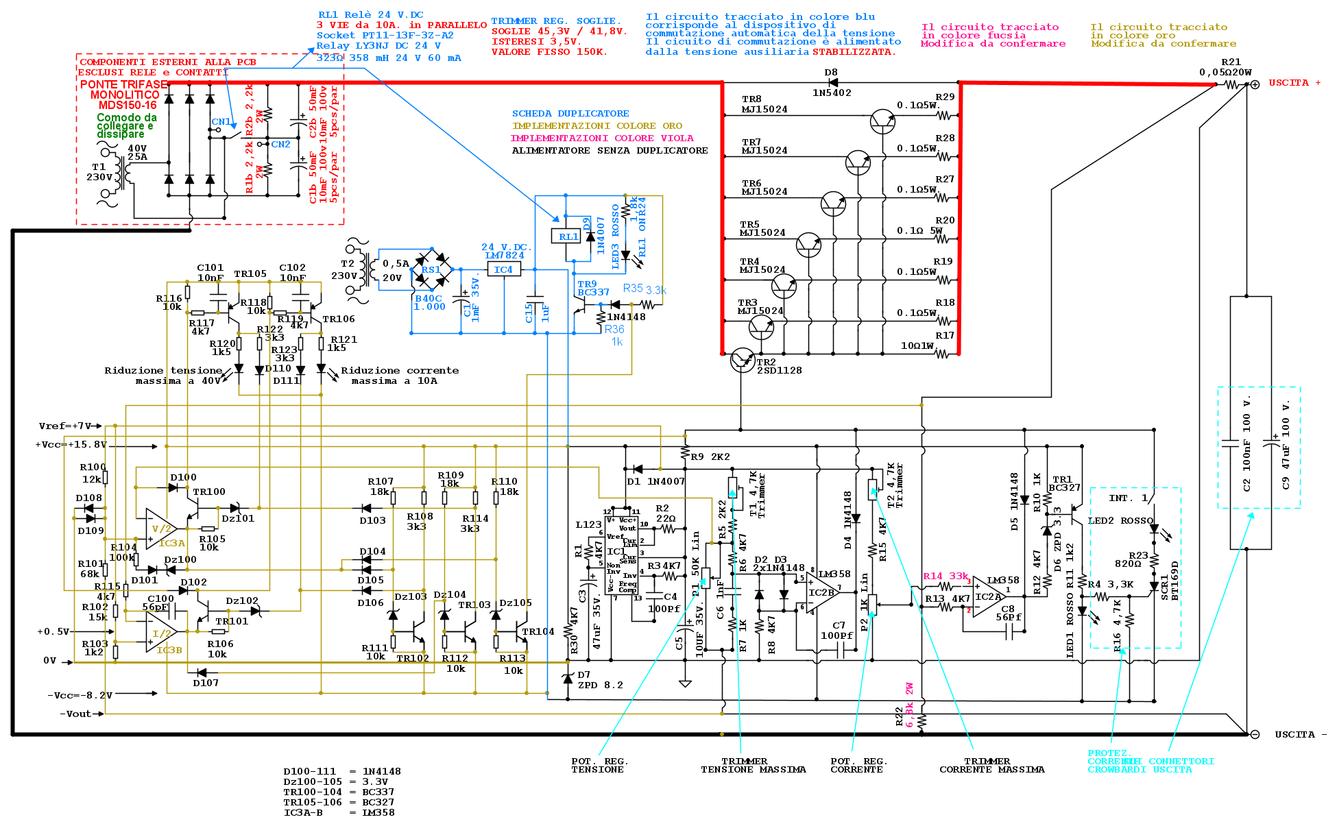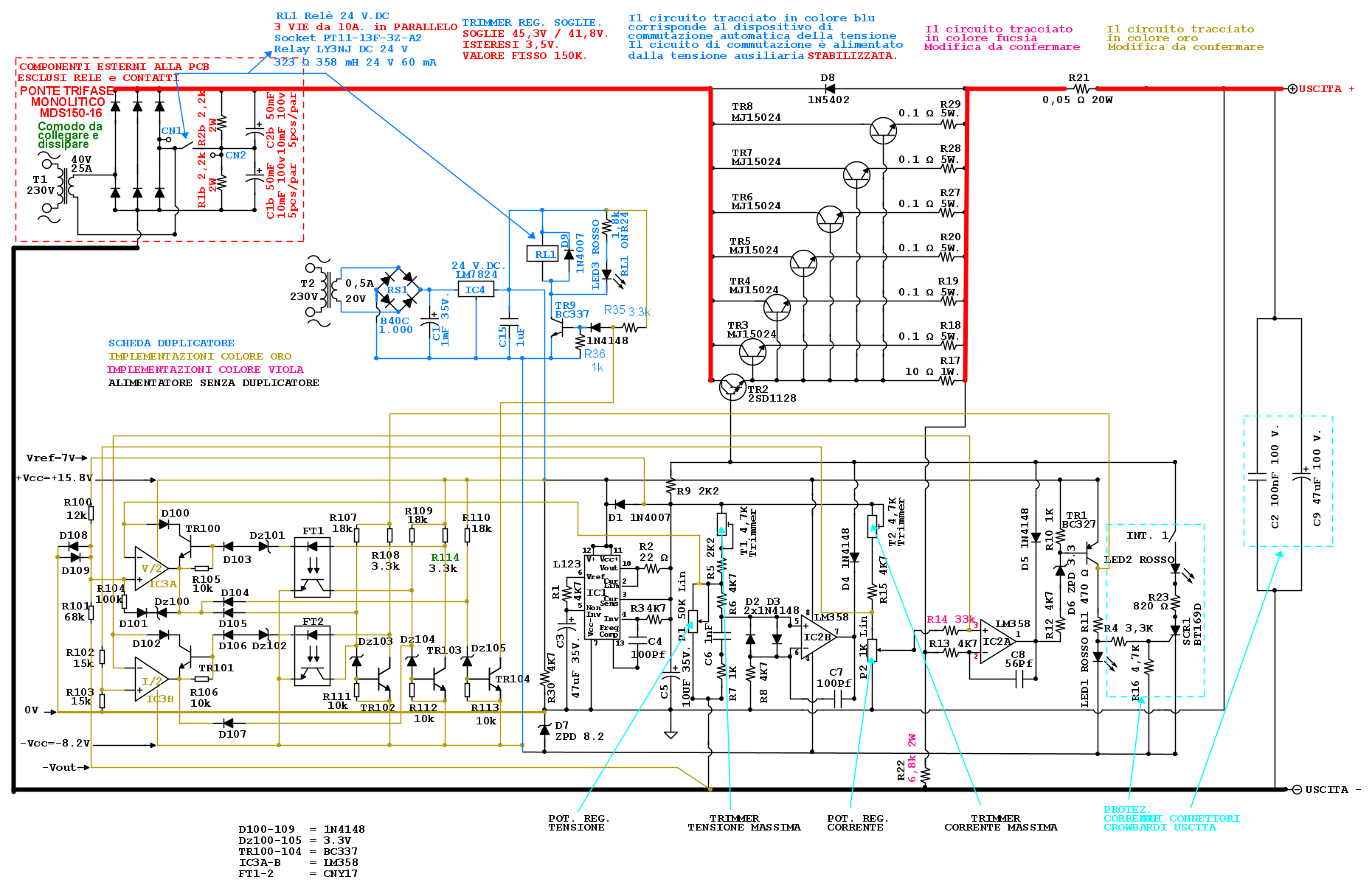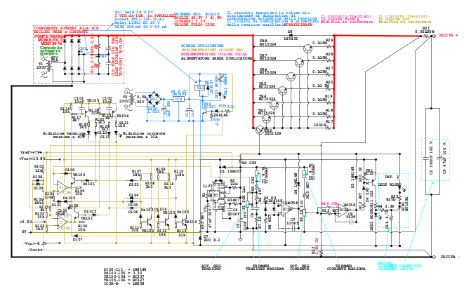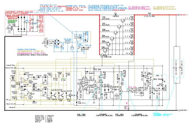 Pubblico lo schema dopo aver eliminato i caratteri anomali ed aver corretto il doppione della resistenza R100, ora divenuta R114 ed è colorata di verde. Spero di non aver saltato qualche modifica perché non potrei fare ulteriori correzioni e dovrei pubblicarne una nuova copia dello schema...