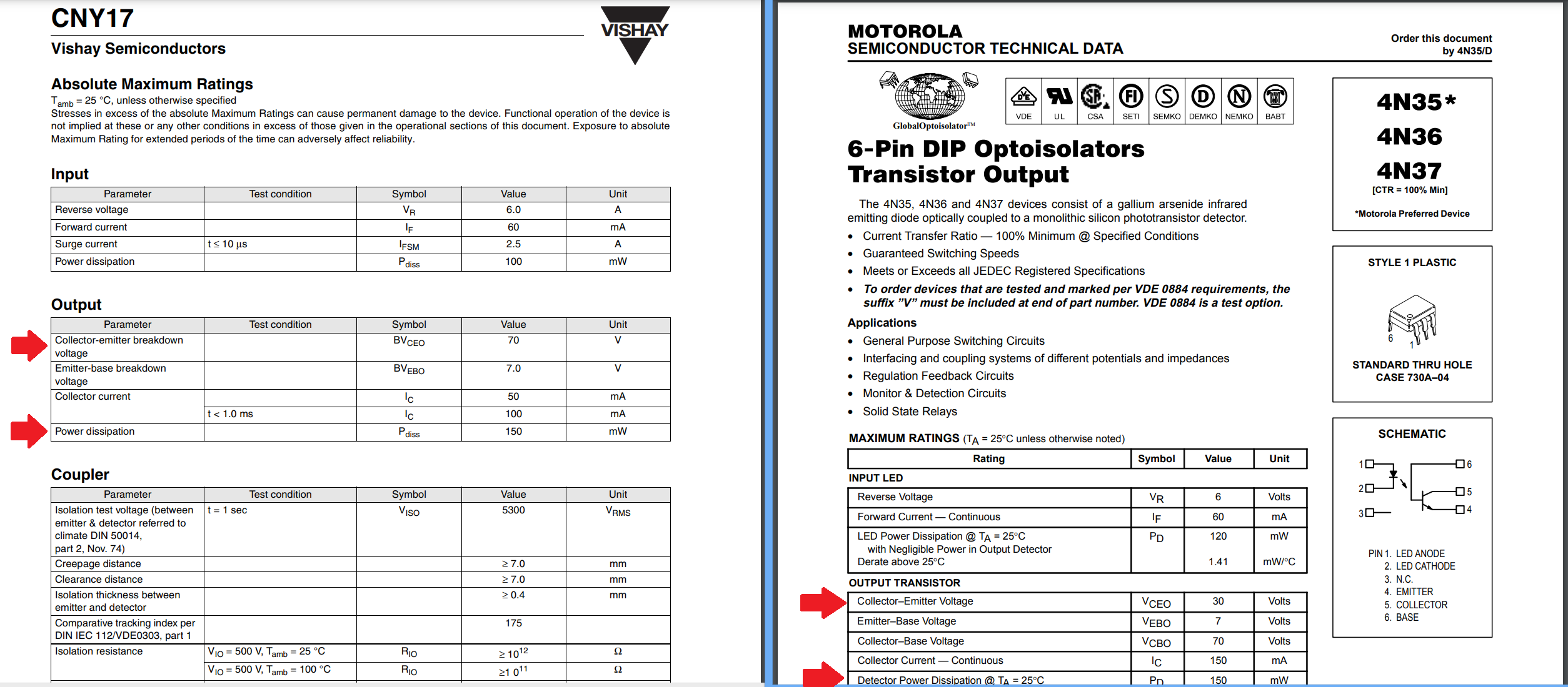 Bruno ma a me la VCE sembra uguale: per i 4N35 la BVCEO è di 70 V come nei CNY17. La Pdiss, invece, nei 4N35 è di 150 mW mente nei CNY17 è 70 mW. Salvo mio errore, i miei 4N35 sembrerebbero addirittura superiori.