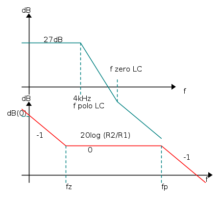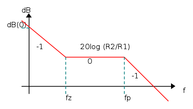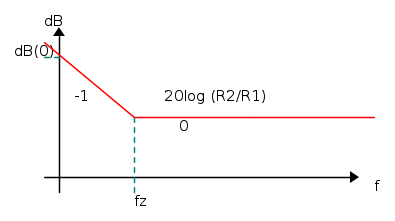 Il condensatore C2 continua a fare il suo lavoro di condensatore, e quindi a dominare la serie, finche' la sua impedenza e` maggiore di R2. Quando |ZC2|=R2 il condensatore C2 si toglie dai piedi, e rimane sono R2. SE a questa frequenza |ZC1| e` ancora >> di R2 il parallelo fra ZC1 e R2 e` dominato da R2 e il guadagno si stabilizza. Questo capita quando R2=\frac{1}{sC_2} e quindi si ha che la frequenza dello zero vale f_z=\frac{1}{2 \pi R_2 C_2}