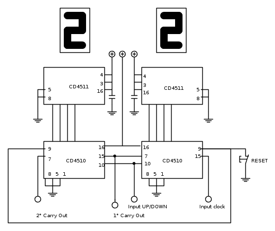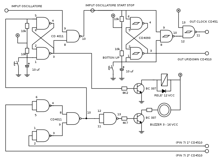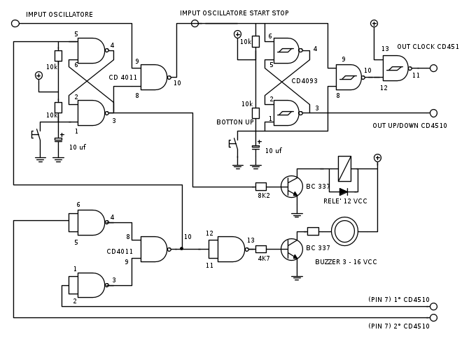 Forse si ho dimenticato qualcosa anche perche era tutto scritto su foglio A4...lo ricopiato su fidocad un po di fretta...tra il pin 14 e 7 dei 4011 ho messo i condensatori da 100nf e anche sul 4093...lo scopo del circuito è un timer per bromografo,un pulsante per incrementare e uno di start per attivare il decremento e il relè... allo 00 bromografo spento e buzz attivato...