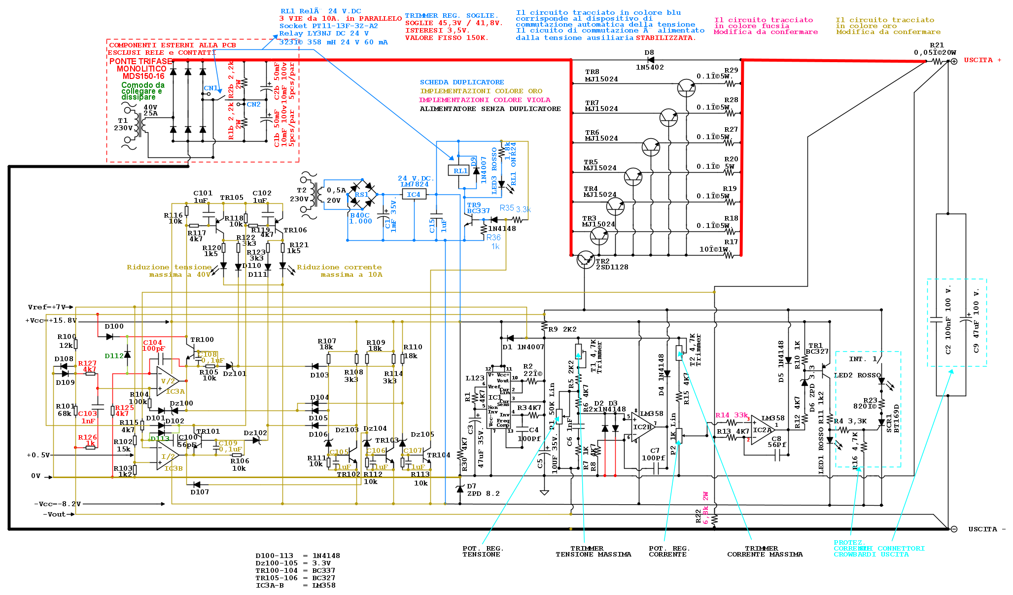 Poi con entrambi i carichi collegati (4.5ohm e 3.5ohm) dovresti partire con P1 a inizio corsa e P2 a fondo corsa e dovresti ruotare P1 fino a che si accende il led nativo della corrente, cosa che avverrà ad una tensione inferiore a 40V (se a 40V la corrente ancora non arriva a 20A e quindi quindi se si accende il nuovo led della tensione, allora dovresti parallelare altre resistenze al carico in modo che la corrente arrivi a 20A prima che la tensione arrivi a 40V e assicurarti che il nuovo led della tensione sia spento) e in queste condizioni dovresti tarare T2 per avere in uscita esattamente una corrente di 20A.