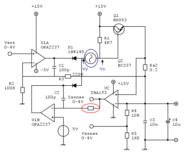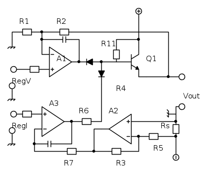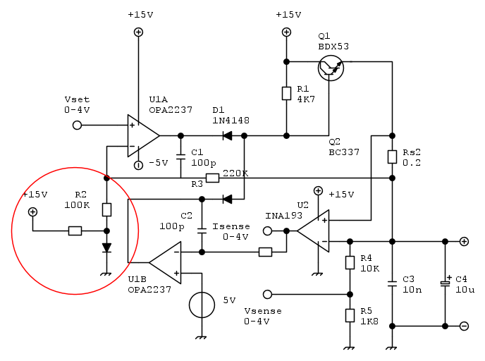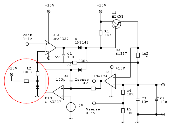 Quello originale mi sembra corretto (a parte la stabilità che è sempre una gran rogna) ma l'altro non mi sembra che funzioni: non capisco anzitutto perché la resistenza di rilevazione della corrente da sotto sia passata sopra (le cose si complicano perché così la misura diventa differenziale) e poi il loop di corrente prenderebbe il sopravvento su quello di tensione già a correnti minime, forse sbaglio ma non vedo più la soglia regolabile per la corrente. Mi sono forse perso qualcosa per strada?