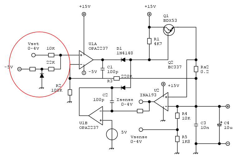 Visto che non posso avere una tensione Vset negativa ho pensato d' inserire un offset positivo sull' ingresso N.I. di U1A, la parte che ho indicato con il cerchio rosso con l' idea di ritrovarmi l' uscita a -0,7V quando Vset = 0V.