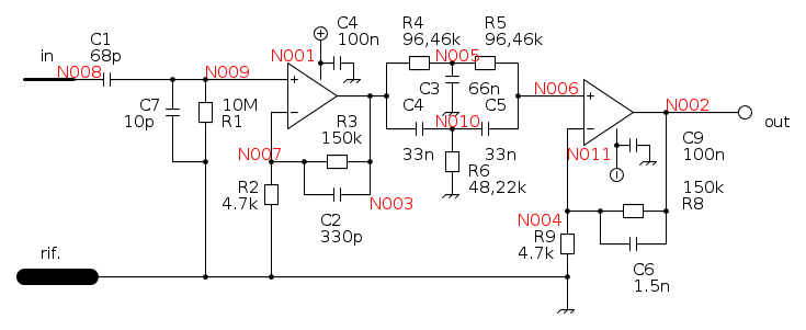 -Tipologia del filtro sallen-key Butterworth o Bessel, in base a quello che mi da miglior compromesso tra non distorsione segnale e piattezza di banda.