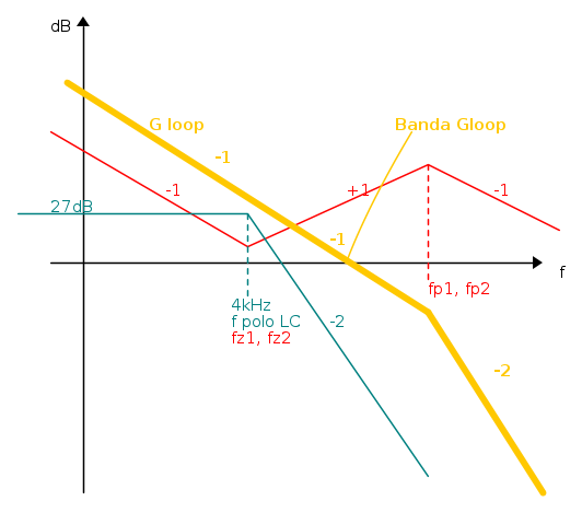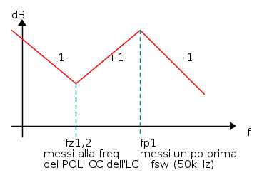 Ora, se dovessi far coincidere i due zeri a li metto in corrispondenza dei poli CC del filtro LC e faccio coincidere i due poli e li metto poco prima della freq di switching, dovrei ottenere: