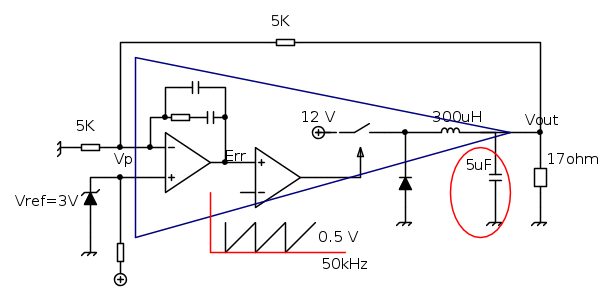 Il condensatore da 5µF e` stato calcolato assumendo trascurabile l'ESR, e cosi` deve stare. Se metti un ceramico non hai lo zero e la compensazione deve essere fatta per quel caso.