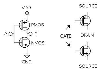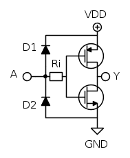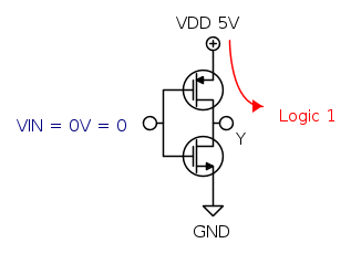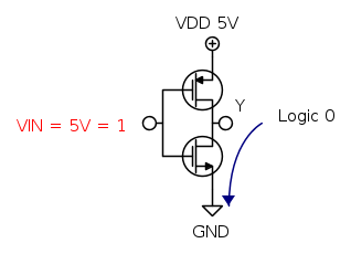 É pero l'NMOS ad essere acceso quindi si comporta come un interruttore chiuso tra Y e GND. Questo vuol dire che se accidentalmente crei un cortociruito tra VDD e Y, senza resistenza, idealmente rompi l'NMOS, realmente direi qualcosa di più perché passa tanta corrente, si scalda il componente e bruci il circuito interno.