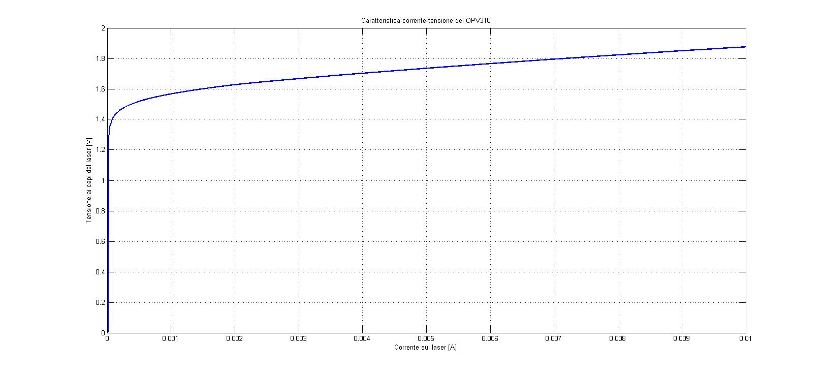 Caratteristica corrente-tensione del laser, con questa posso calcolarmi la resistenza equivalente di piccolo segnale. E' stata fatta variando la tensione in ingresso da 0 a 1V a passi di 1mV. La corrente è calcolata in base alla tensione reale impressa dal generatore, mentre la tensione sul diodo è misurata.