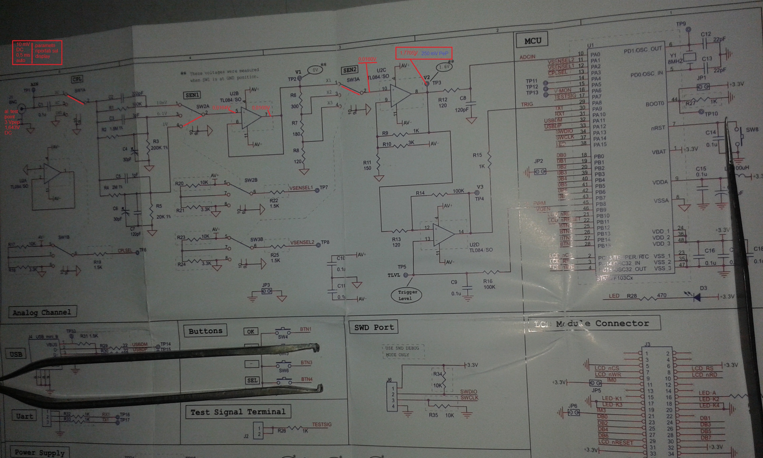 Aver verificato che in pratica l'incremento di tensione all'uscita della catena, cioè all'ingresso dell'MCU, corrisponda al valore teorico, ci ha assicurato che l'intera catena, costituita dai due attenuatori e dai due amplificatori, fa quello che deve fare.