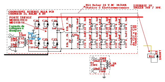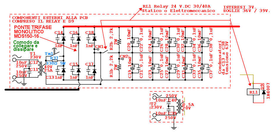Etemenanki ha scritto:Avrei suggerito anche, ma non e' una cosa indispensabile, dei 100n ceramici o poliestere in parallelo ai banchi di condensatoroni e altri ceramici da 10n fra gli ingressi del trasformatore e la massa del contenitore (per spegnere eventuali disturbi AF provenienti dalla rete), non credo serva mettere dei ceramici da 1n in parallelo ai diodi per ridurre il rumore che provocano, ma servirebbe l'oscilloscopio per rilevare la presenza o meno di tali disturbi.