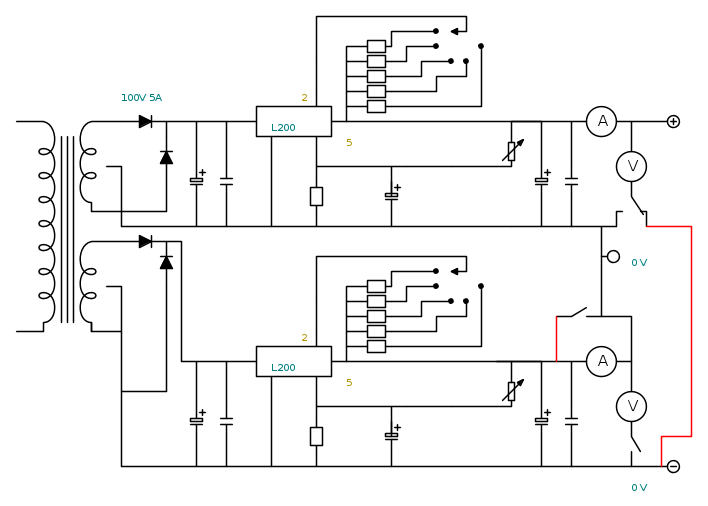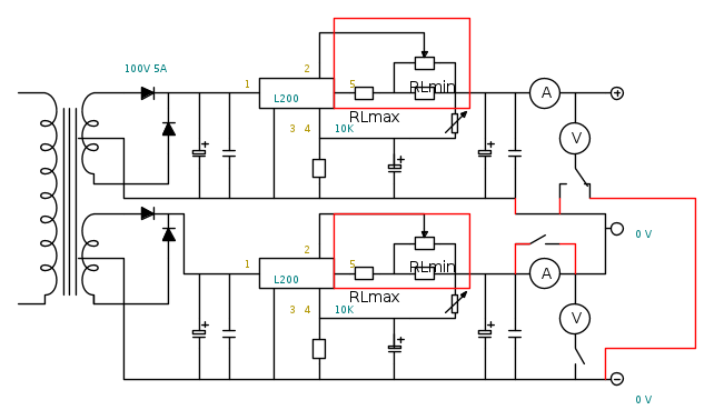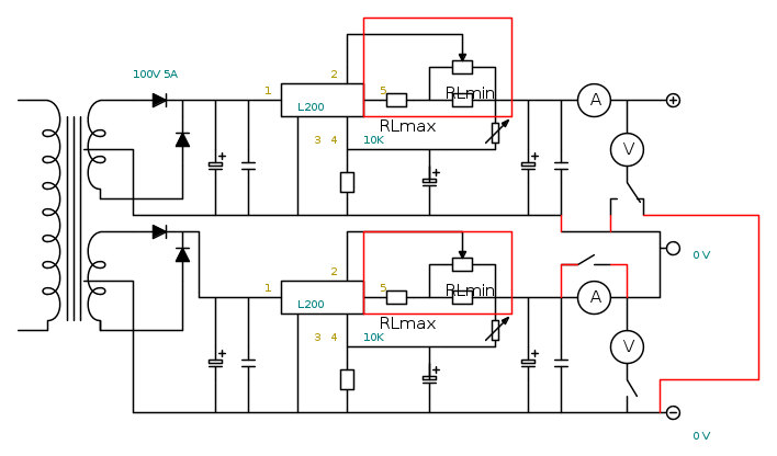 allora, con una serie di interruttori-deviatori si fa diventare unico l'amperometro ed il voltmetro... ma come si fa a far diventare unica la regolazione di tensione e corrente? e soprattutto è possibile con questo tipo di circuito?