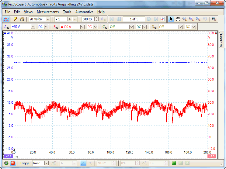 Come vedi c'è una bella oscillazione a bassa frequenza (ripple di velocità dell'albero motore), ripple a frequenza più elevata (dipendente dal numero di fasi e poli dell'alternatore), rumore (quello arriva un po' da dovunque, pensa solo ai contatti striscianti), et cetera.