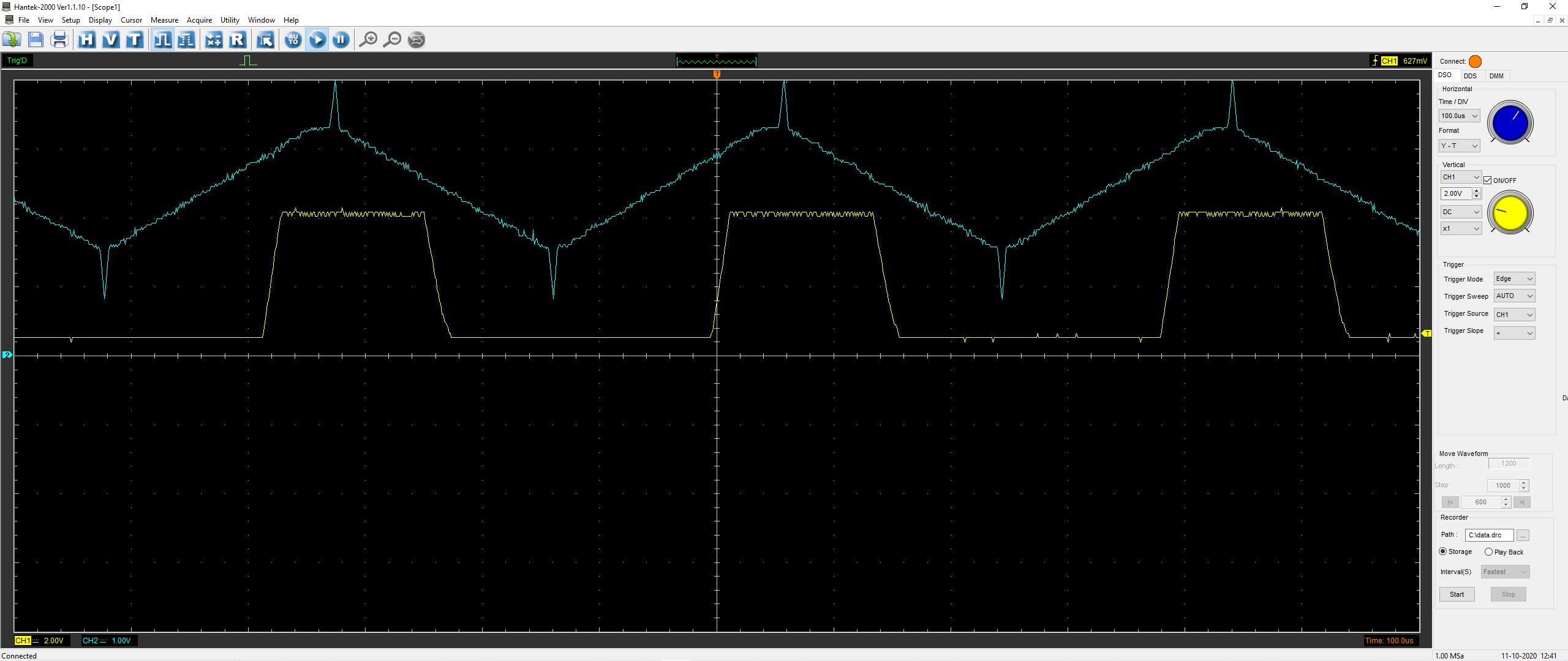 Io vedo che la gialla varia tra 0,5 volt circa e poco piú di 4 volt, mentre la azzurra varia tra 1 volt e 4 volt