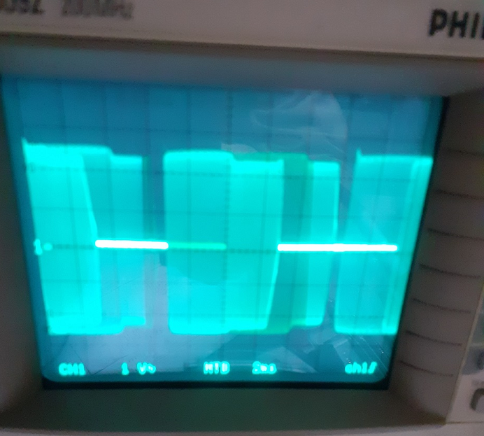 Per Bruno, le impostazioni dell'oscilloscopio sono sull'immagine; 0.5us/div, 1 V/div AC, lo Zero è segnato dalla lineetta accanto al n° 1 a sx dello schermo in centro.