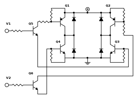 Ma simulando in PSpice con il ponte H, un transistor che dovrebbe rimanere interdetto (visto che sulla base c'è una tensione negativa) invece conduce, facendo rimanere bassa la tensione sul pallino rosso (mentre il pallino ha bassa tensione giustamente). Spero si sia capito!