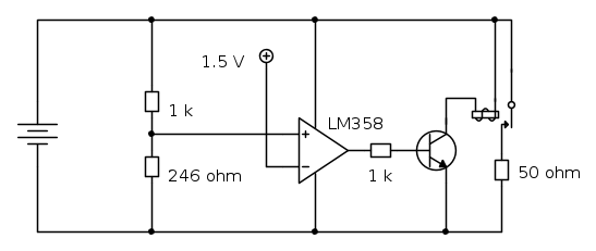 Il pacco batteria si scarica sulla resistenza da 50 Ω attraverso il relè. Avrei bisogno che una volta che la tensione della batteria giunge ai 7.6 V l'operazionale spenga il transistor e quindi il relè; la tensione di riferimento di 1.5 V la ottengo tramite il regolatore MCP1702, l'npn è un BC547.