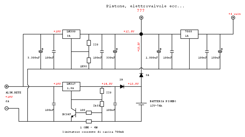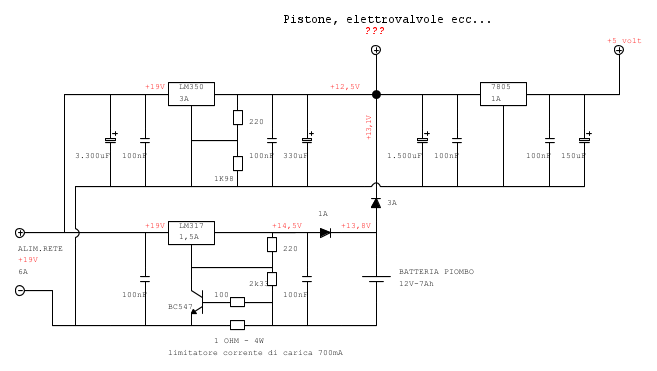 andrewto ha scritto:devo alimentare una macchina che funziona a 12 V 2,5A (pistoni, elettrovalvole ecc...) e a 5 volt (PIC)