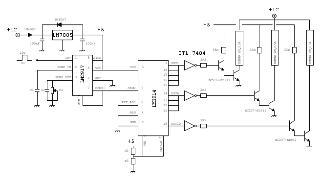però il mio progetto ha delle differenze, le strisce di led da pilotare sono 3 quindi dovrebbe bastare un solo 3914, poi i le strisce di led non devono accendersi insieme ma una sola alla volta(agire quindi sul pin 9in teoria).