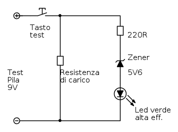 Veniamo all'indicazione del led: un led verde ha una Vf di circa 1,5V sommata allo zener (5V6) hai una soglia di circa 7,1V sotto la quale (led verde spento) puoi considerare la pila scarica; e sopra la quale (led verde acceso) puoi considerare la pila, almeno parzialmente carica.