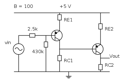 Per l'università dovremmo progettare uno stadio amplificante a due BJT , come quello in figura, dimensionando le resistenze e la polarizzazione per ottenere un :
