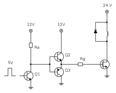 Q1 insieme a Ta permettono di pilotare il totem pole tra 0 e 12V. Ra non deve necessariamente essere piccola perché deve solo garantire la corrente in base a Q2 che è i1/betesimo di quella che mi servirà per accendere il MOS.