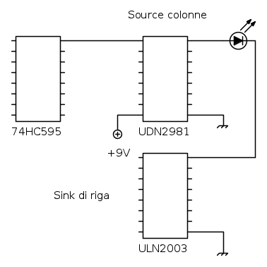 Così l'input dell'UDN viene preso dall'output del 595 e le uscite dell'UDN (più performanti) direttamente collegate ai led senza alcuna resistenza limitatrice. L'UDN sarà alimentato separatamente con una tensione maggiore dei +5V per poter fornire la giusta tensione/corrente ai led. Ho già fatto dei test e con una alimentazione di +9V ottengo un ottima luminosità. Non vorrei però che la corrente andasse oltre le specifiche del led.