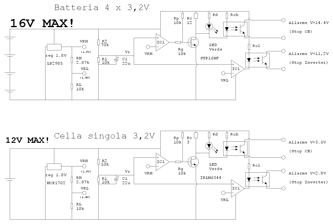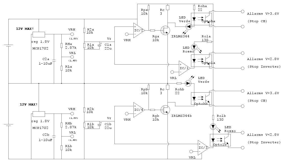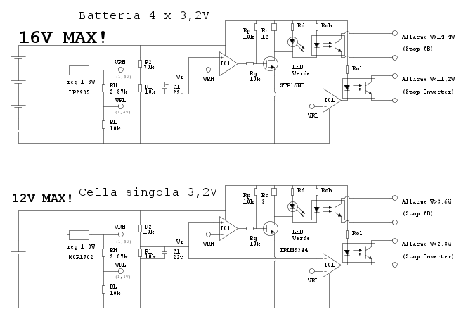 Riguardo le R, credo ti riferisci alle 22Ohm: sono dimensionate per stare ampiamente sotto le correnti max di LED e opto, considera che la tensione di cella applicata sarà praticamente costante intorno ai 3,6V..se dovesse salire oltre i 4V il problema non sarebbe il LED che fonde, ma la cella Litio...speriamo di no!