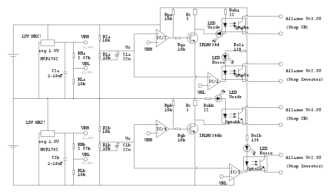 Un paio di osservazioni: da qualche parte serve una isteresi altrimenti quando spegni l'inverter per che' le batterie sono basse, la tensione risale dato che non hai piu` carico. E analogamente per la soglia della tensione elevata.