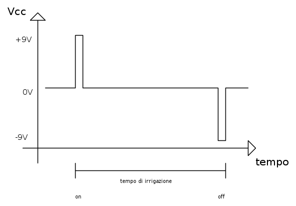 non avendo il rubinetto dell'acqua, mi sono arrangiato utilizzando un bidone dell'acqua da 50 litri, ci ho collegato un tubicino in gomma per irrigazione, il quale porta l'acqua ad una pompetta ricavata dallo strumento che utilizzavo per pulire l'apparecchio per denti che avevo da piccolo. il problema è utilizzare il programmatore per far accendere la pompetta. in origine il programmatore azionava una elettrovalvola, dando un impulso di un secondo per l'apertura, e un impulso con polarità invertita per la chiusura, alla fine del tempo di irrigazione.