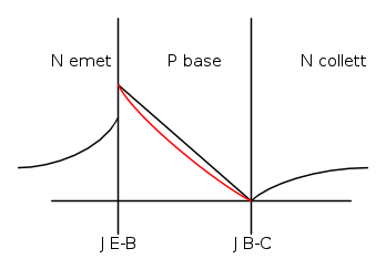Sul libro (Sedra-Smith, 6a edizione) si dice che il profilo di minoritari nella base non è a pendenza costante (che significa una corrente costante), ma è più "spanciato", a causa delle ricombinazioni elettroni-lacune; in questo caso, le due derivate, tra una giunzione e l'altra, sono differenti, comportanto correnti di elettroni maggiori in prossimità della giunzione E-B e inferiori in B-C; è giusto interpretare tale differenza di corrente come la
