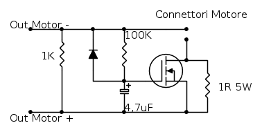 Per ovviare al problema avrei pensato ad un circuito di soft start come questo da collegare alle uscite Motor+ e Motor - del precedente schema: