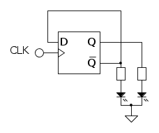 che dovrebbe far accendere alternativamente, ad ogni impulso in entrata, i 2 led posti in uscita.