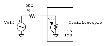 dove ho modellato l'oscilloscopio con la sua resistenza di ingresso (non ho disegnato la capacità di ingresso). Il segnale in ingresso all'oscilloscopio è Vin, prova a vedere quanto vale in relazione a Veff (ad esempio con il partitore di tensione).