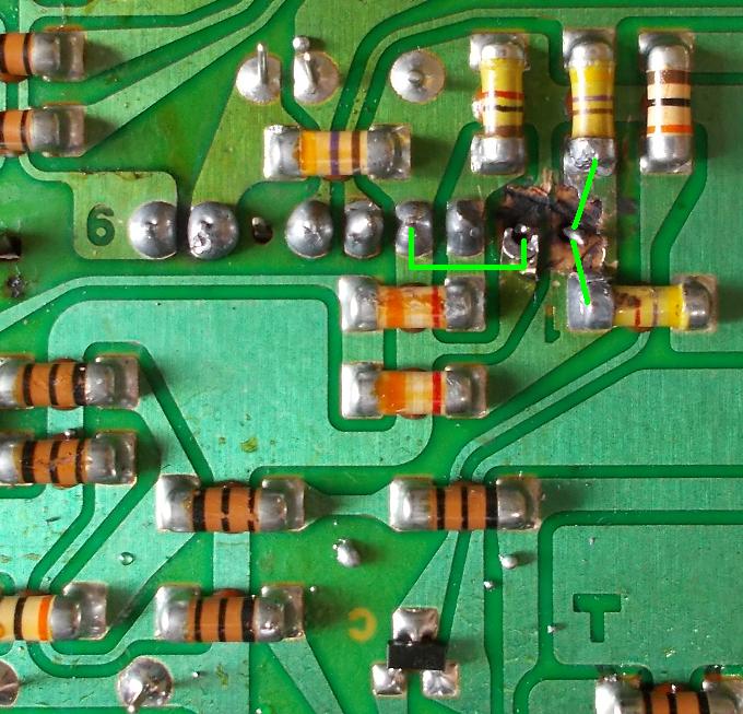 Mi pare di aver commesso un errore, tanto per cominciare: credevo che, nel caso di piste interrotte, si potessero collegare direttamente tra loro gli elementi implicati nell'interuzione, come avevo ipotizzato nella foto coi collegamenti disegnati in verde. Premessa la mia ignoranza nella materia, e volendo imparare, chiedo come mai non si può procedere in questa maniera.