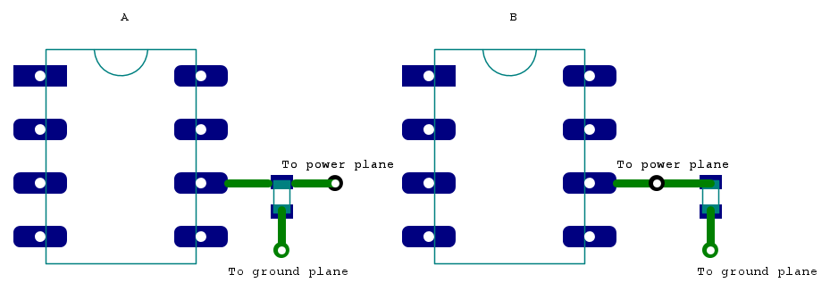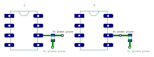 vorrei conoscere la vostra posizione in merito alla posizione del via (verso il power plane) tra il condensatore di bypass ed il piedino Vdd/Vcc di un circuito integrato. Ho disegnato in Fido Cad le due possibilità, a voi la parola :)