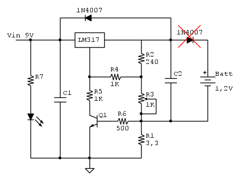 Considerando un diodo (diciamo un 1N4007 che ho in casa) in serie all'uscita per evitare la scarica sul circuito dovessi spegnerlo senza prima togliere la batteria carica, con una Vf da 1,1V, i 0,6V sulla R1 prima di attivare Q1 e a una tensione di carica della batteria che assumiamo pari a 1,5V, abbiamo che l'LM317 in uscita dovrà essere tarato per fornire 3,2V quindi una R3 regolabile attorno ai 300ohm (1,5V/5mA) diciamo 1K potrebbe andare.