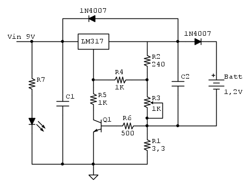 La R1 serve a limitare la corrente di carica. Diciamo che voglio caricare una NiMh da 1900mAh come da indicazioni a 1/10 C, assumendo una Vbe di 0,6V e una I di 0,19mA ottengo 3,16 ohm da arrotondare ai valori commerciali.